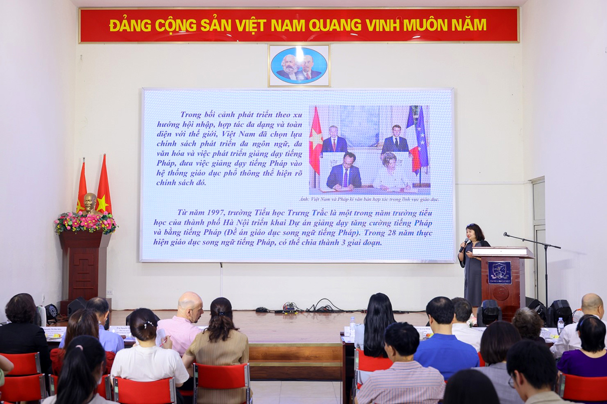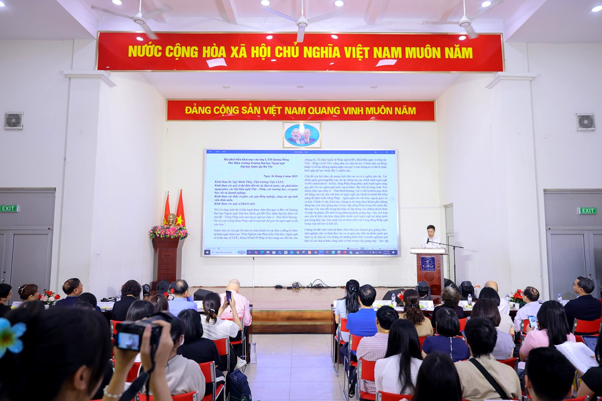 Chiều ngày 26/4/2025, tại Trường Đại học Ngoại ngữ – Đại học Quốc gia Hà Nội, hội thảo khoa học với chủ đề “Tiếng Pháp như là ngoại ngữ tại châu Á – Thái Bình Dương: Vai trò của Cộng đồng Pháp ngữ trong thế giới đa ngôn ngữ và đa văn hóa” đã diễn ra thành công, thu hút sự tham gia đông đảo của các nhà khoa học, nhà quản lý, giảng viên, giáo viên tiếng Pháp và sinh viên đến từ nhiều trường đại học, cơ sở giáo dục trong nước và quốc tế.