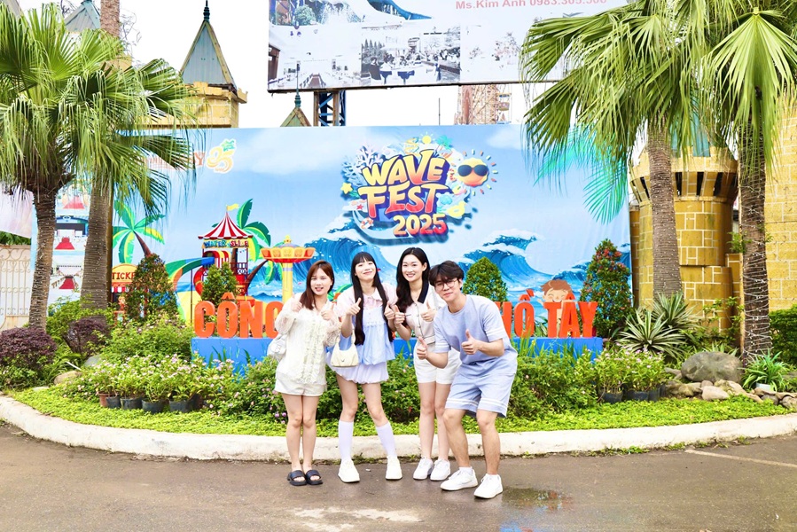 Ngay khi bước qua cổng Công viên, du khách sẽ được chào đón bởi không gian check-in độc đáo với Đu quay khổng lồ, những quả cherry đỏ mọng, chú Thỏ tai dài ngộ nghĩnh và chú Ong xinh đẹp, vui nhộn cùng thảm hoa rực rỡ sắc màu. Tiến sâu vào bên trong, hai bên đường ngập tràn những vườn hoa được bài trí hài hòa giữa thiên nhiên và nghệ thuật, tạo nên không gian thư thái, trong lành để du khách dừng chân, chiêm ngưỡng và hít thở bầu không khí mát lành trước khi thỏa sức đắm mình vào làn nước xanh mát.